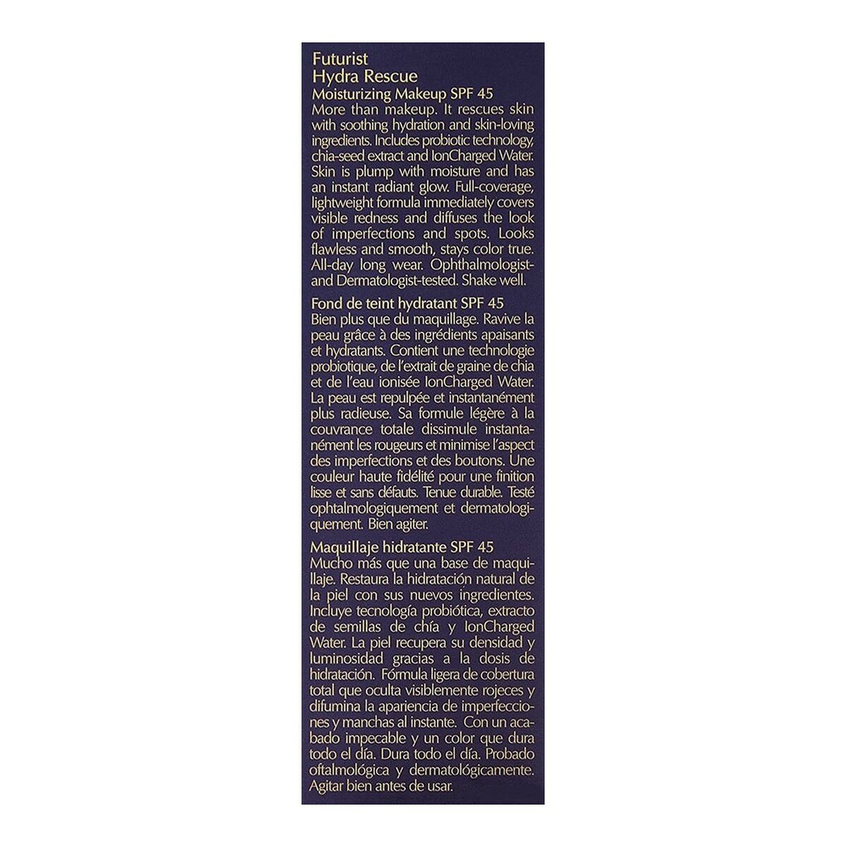 El Futurist Hydra Rescue de Estée Lauder es una avanzada base de maquillaje cremosa formulada para proporcionar una cobertura uniforme y duradera con un acabado natural y confortable. Diseñada para un público unisex, esta base se presenta en tonos clave como negro, beige y el tono específico Nº 3C2-Pebble, adaptándose a diferentes tonos de piel. Su textura fluida y cremosa facilita una aplicación suave y uniforme, permitiendo un acabado impecable sin sensación pesada. Además, incorpora un protector solar SPF 45 que protege la piel frente a los daños provocados por la radiación UV, un factor imprescindible para el cuidado diario del rostro. Su formulación resistente al agua aumenta la durabilidad del maquillaje incluso en condiciones húmedas o de sudoración, asegurando un acabado intacto durante más tiempo. Fabricada y distribuida en España y Estados Unidos, esta base destaca por su calidad premium dentro del segmento de maquillaje hidratante, combinando cobertura con beneficios nutritivos para la piel. El Futurist Hydra Rescue es una opción técnica y funcional para quienes buscan un maquillaje que aporte tanto protección como una piel con aspecto saludable y homogéneo, ideal para uso diario. Su equilibrio entre resistencia, hidratación y confort la posiciona como un producto de referencia para quienes valoran la eficacia y el cuidado en su base de maquillaje.
