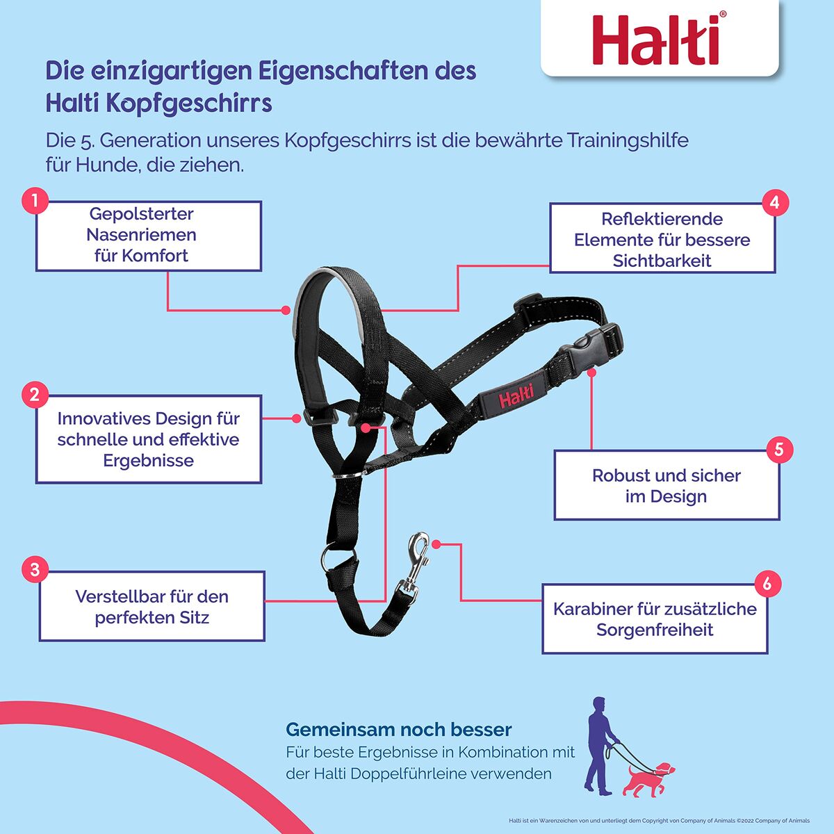 Este bozal Halti de 5.ª generación tiene una función única de respuesta antitirones para controlar y adiestrar