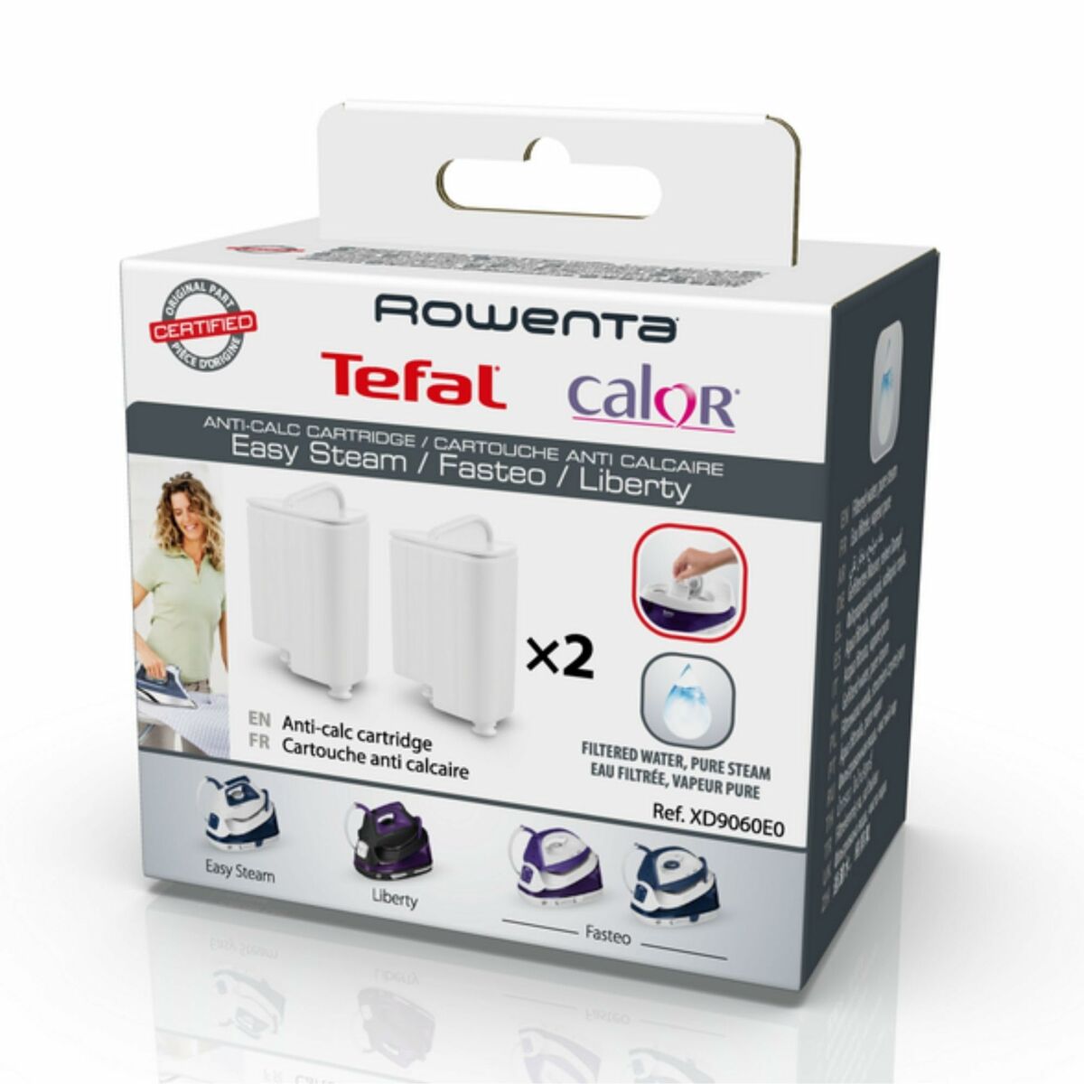 Tefal XD9060. Tipo: Cartucho antical para plancha, Color del producto: Blanco, Coloración de superficie: Monocromo. Ancho del paquete: 72 mm, Profundidad del paquete: 138 mm, Altura del paquete: 110 mm. Cantidad por paquete: 1 pieza(s)