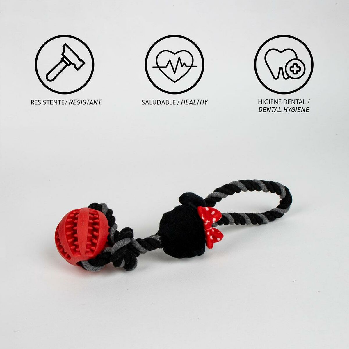 El juguete para perros de la marca Minnie Mouse es un accesorio diseñado para proporcionar entretenimiento y durabilidad durante el juego de las mascotas. Fabricado con una combinación de materiales resistentes y seguros, este producto integra poliéster, algodón y TPR (caucho termoplástico), lo que garantiza una estructura sólida y flexible que soporta la fuerza natural de los perros al morder y tirar. Su diseño principal es una cuerda en un llamativo color rojo, adecuada para juegos de tracción y mordisqueo que fomentan la actividad física y la estimulación mental de los canes. Este tipo de juguete es idóneo para perros, favoreciendo la interacción entre la mascota y su dueño, además de ayudar a mantener una buena salud dental al colaborar en la limpieza suave de sus dientes durante el juego. La manufactura en China asegura un producto que combina funcionalidad con un nivel adecuado de calidad para su categoría, ofreciendo resistencia y adaptabilidad a distintas razas y tamaños de perros. Este juguete destaca por ser un complemento cómodo, seguro y entretenido, ideal para el bienestar y la diversión diaria de los animales de compañía. En conjunto, representa una opción práctica dentro de los juguetes caninos que priorizan la resistencia y la experiencia de juego activa.